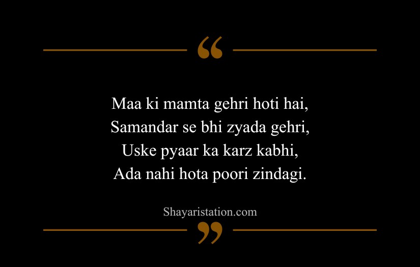 Maa shayari in English expresses the pure, selfless, and unconditional love of a mother. Inspired by poets and thinkers like Khalil Gibran, Rabindranath Tagore, and Rumi, this form of shayari presents a mother as the heart of the family and the first teacher in life. It reflects gratitude, respect, and deep emotional attachment.