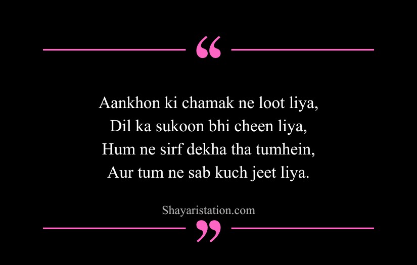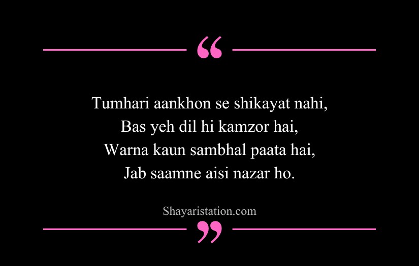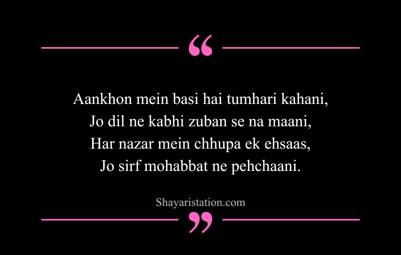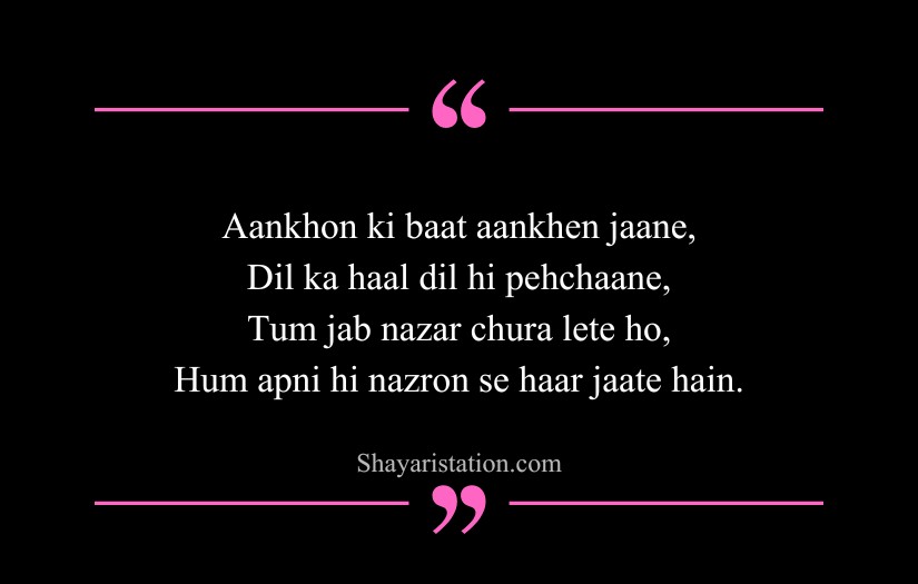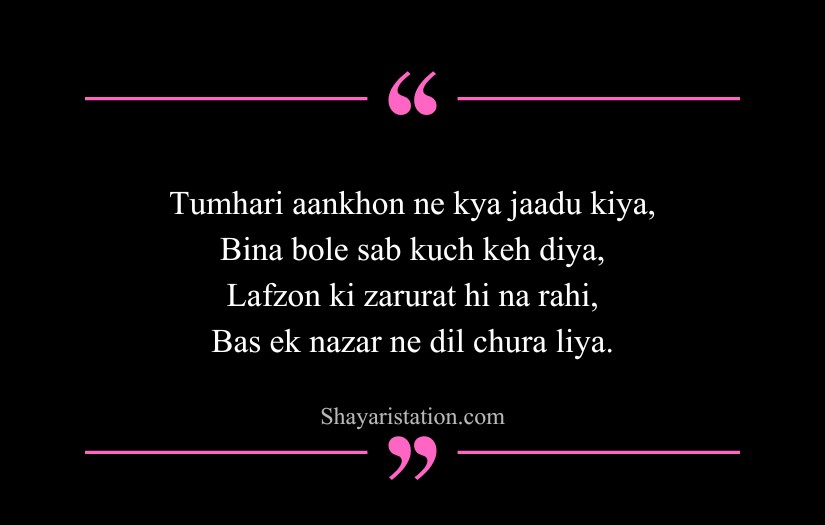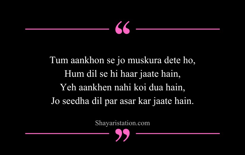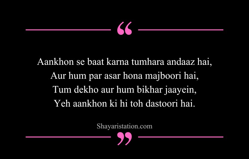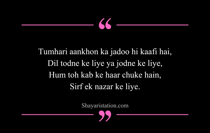 Shayari on eyes in English captures the deep beauty, mystery, and silent emotions hidden within a single glance. Inspired by poets like Mirza Ghalib, Rumi, and William Shakespeare, this form of shayari presents eyes as storytellers that speak without words. A simple look is shown as powerful enough to express love, pain, and longing.